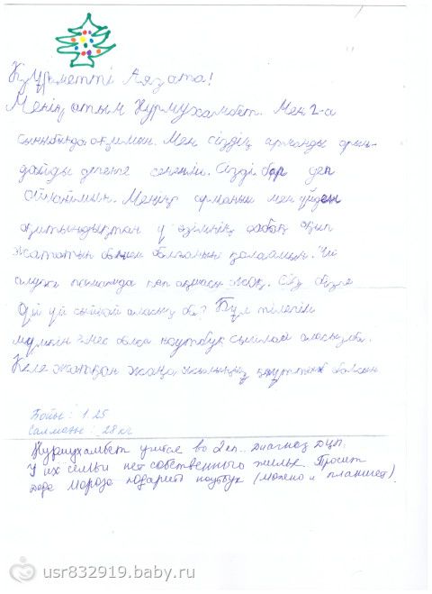 Нурмухамбет. Учится во втором классе. Диагноз ДЦП. У их семьи нет собственного жилья. Просит деда мороза подарить ноутбук(можно и планшет).