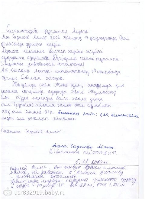Садихов Алмас. 12 лет. Диагноз умер.умственная отсталость. Живут вдвоем с мамой. Его мама безработная. Просит деда мороза подарить ему зимнуюю куртку, и зимнюю обувь. Размер 38, рост 1м20см. Вес 22кг. Примечание от нас: этой семье можно помочь еще чем нибудь, игрушки, книжки, одежда и тд.