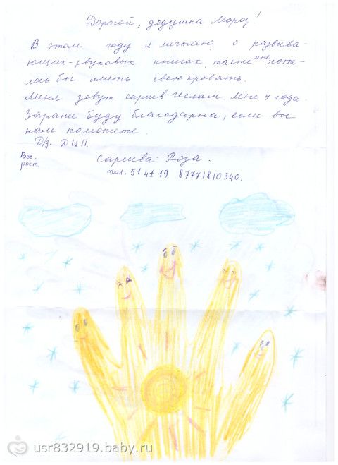 Сариев Ислам. 4 года. Диагноз ДЦП. Мечтает о развивающей звуковой книге, также ему хотелось бы иметь свою кровать. Примечание от нас: может быть у кого нибудь осталась кровать от ребенка, который уже подрос.