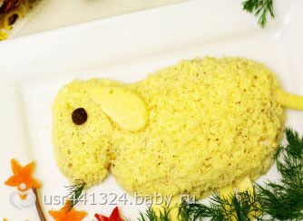 Формируем из массы салата тело овечки и голову, два овала, один больше, другой меньше.