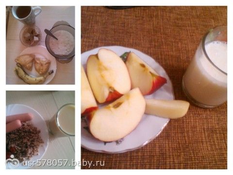 Завтрак: овсянка на молоке, один курник, пару кусочков халвы, чай с лимоном и сахаром, банан.