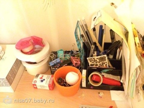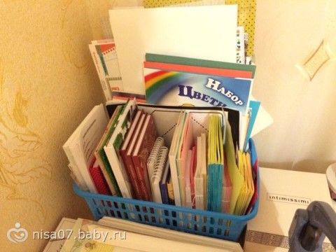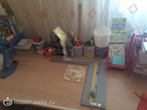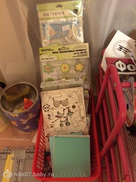 Рядом стоит корзина с ожидающими проектами или заготовками, прошитыми блоками для блокнотов, так же детский альбом стоит ждет пока очередь до него наконец дойдет))))