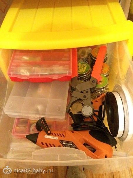 в первой полке я храню подвески, украшения, пуговки, клеевой пистолет и сами люверсы и хольнитены в баночках