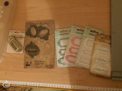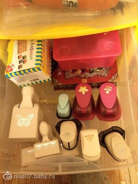 Во второй полке чернильные подушечки и дыроколы) Лично я покупала себе 3 дырокола) бабочку, кружевной и угловой, остальные мне одолжила, а цветочки и листочки подарила мама мужа) вот так мне повезло)) а еще штампики с буквами она нам отдала) нам — дочурке, ноя их присвоила пока))))