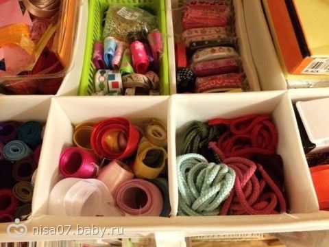 на третьей полке у меня расположены ленты, корзинка с блокнотиками которые я веду и там еще немного… конечно же тканей))