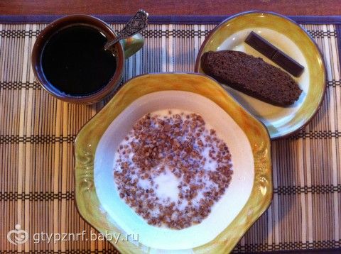 Завтрак: Греча с молоком, кекс ПП 3 муки, горький шоколад, кофе черный.