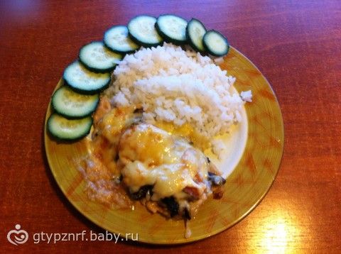 Обед: Рис, куриное филе под шубой (филе, чуть сметаны, лук, шампиньоны, помидорка, сыр 17%), 1/2 огурца .