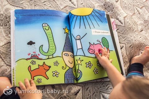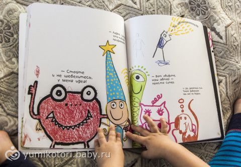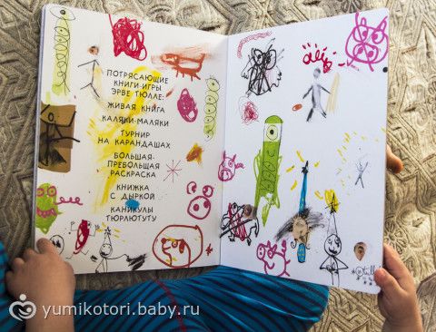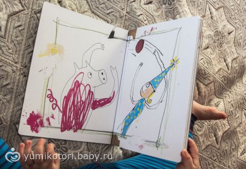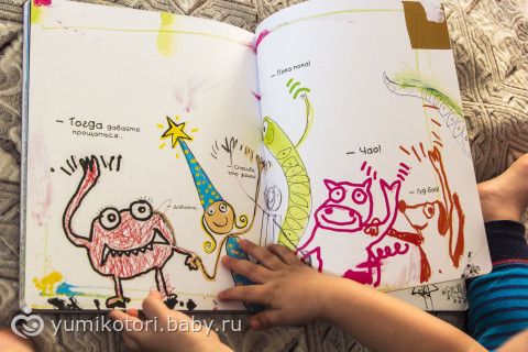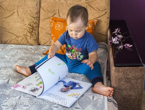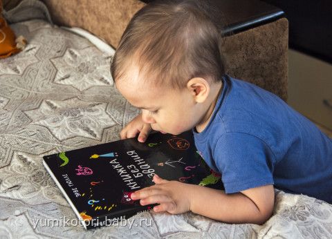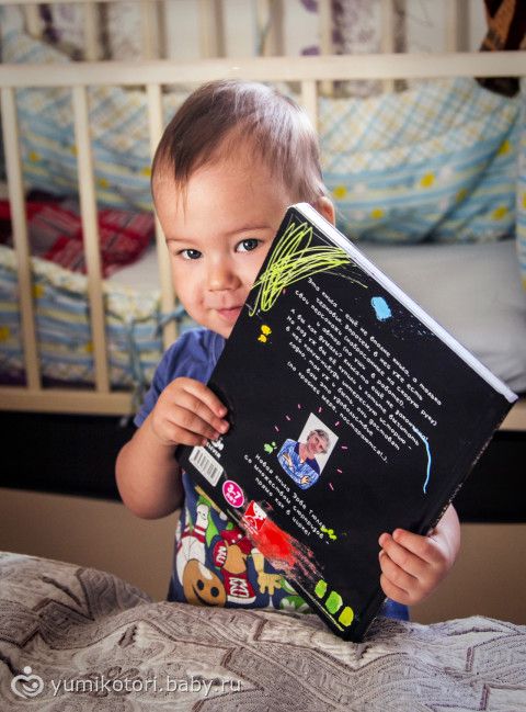 Книга очень необычная! По задумке автора — она не закончена. И ребенок должен сам ее завершить по своему усмотрению! (разрисовать, обклеить и т.д.). Пока что Миша просто с восторгом смотрит картинки. Еще чуть подрастет — разрисует!