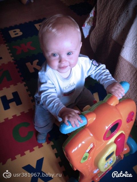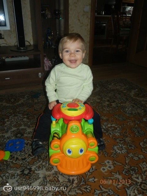 классная лошадка))) мы на паровозе гоняем. сначала толкал его как ходунки, теперь везде на нём))