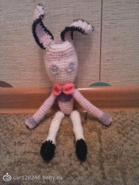 1) Т.к.времени у меня теперь больше свободного, ввиду исключения зомбоящика, довязала зайца, точнее это обвязанная погремушка. Ну страшненький немного вышел, зато с любовью! )) Правда Диана ему скоро ноги оторвет.))