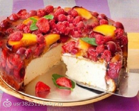 - В завершении выкладываем на пирог ягоды и фрукты в любом виде(свежие, замороженные или консервированные). Как только мы оформили торт, заливаем его желе(2 стакана сиропа, с бланшированными фруктами и 1 стакан желатина)