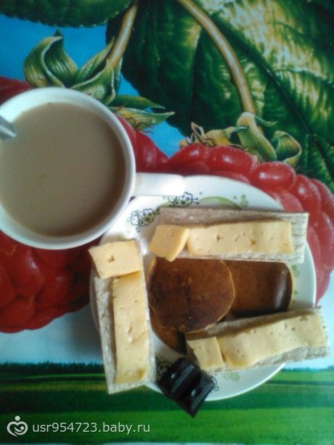 Итак завтрак- оладьи 3 шт, 3 хлебца с сыром, кофе с молоком, горький шоколад