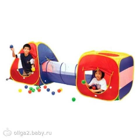 У нас вот такая. Не скажу, что удобная, места занимает ОЧЕНЬ много. Я убрала тоннель, теперь один домик под игрушки, а второй под шарики. Единственное, что нам нравится, так это играть с шариками(выбрасывать из палатки). Тоннелем интересовались первые пару часов.