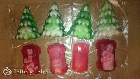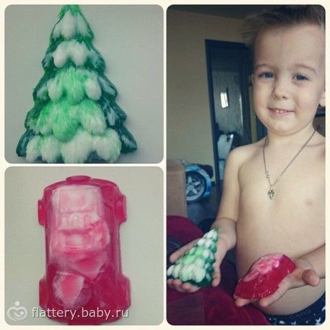 Лешка сделал мыло в подарок бабушкам, дедушкам, тетям и сестрам, и подружкам =) девочкам елочки, а мальчикам машинки =) так и не уговорила подарить машинку девочке, видать считает, что машинки это сугубо мужские игрушки =)))) Довольный мой сыночек, что подарочки получились =)