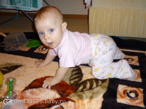 Сначала ползала на пузе, потом на четвереньках назад, а через две недельки научилась ползать вперёд. Научилась сидеть без опоры. Ползет назад, сядет, посидит.