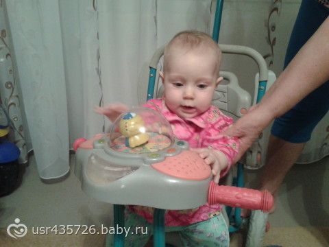 Бабушка с дедушкой катают дочу на велосипеде или на ослике, она в восторге! Пробовали ставить дочу в ходунки, но она заваливается на бок, так что отложили это дело на потом.