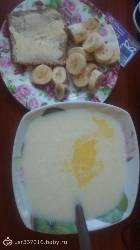 Завтрак: Каша манная 350 грамм(очень захотела), масло 7 грамм, хлеб 30 грамм, банан 100 грамм