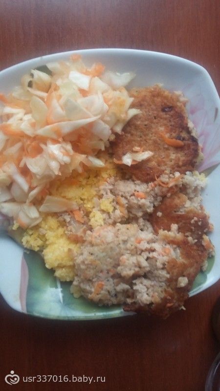 Обед: Соевые котлеты 250 грамм, салат из капусты и моркови, крупа кукурузная в сыром виде была 50 грамм.за кадром 30 грамм хлеба
