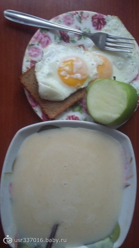 Завтрак: Каша манная на молоководе что то другие крупы кончились.только кукурузная а её долго варить а мы сегодня итак позже встали.яблоко 150 грамм, яйцо 100 грамм, хлеб 30 грамм.