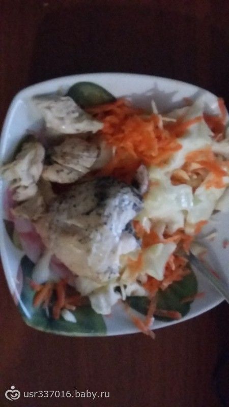 Ужин: ранний сегодня но наконец то мой жор кончился салат недоела.150 грамм запечёной куриной грудке, не мариновала просто в соли и перце тоже вкусно и салат из капусты и моркови