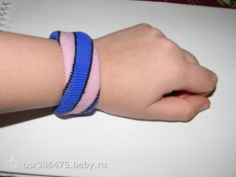 А потом взялась за то, что давно хотела — вязаный широкий браслет столбиком. Он правда без замочка. Внутри зашита основа из детского браслета (с Растишкой продавался) на руке смотрится классно, но при носке лучше сильно не размахивать рукой. Вот такой полосатик у меня получился.