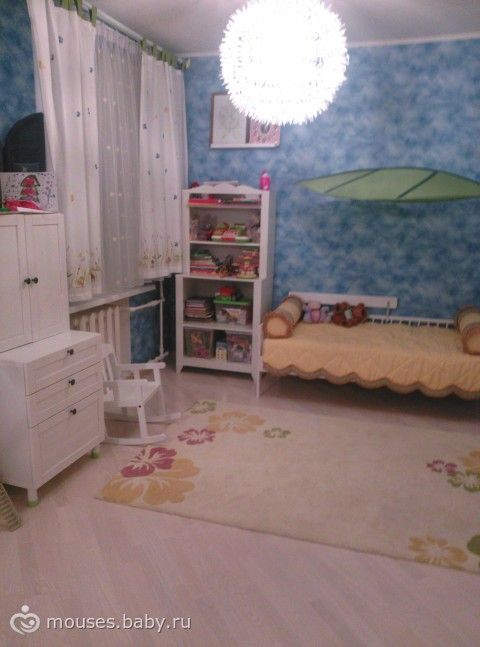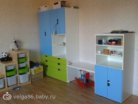 у нас икеа. комната большая, так что есть где развернуться. с-ма шкафов (3 для одежды+книжный), тумбочка, рабочее место, кровать, кресло-качалка. Только дочка все равно там не живет — просто игровая пока(