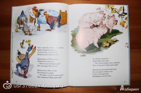Еще рекомендую 2ые экземпляры Чуковского взять издательства Алтей ( они стоят рублей 15, — брать лучше на бумаге, а не картоне. На картоне мне цветопередача не понравилась) там отличные рисунки Кобзырева — вот 1 пример покажу