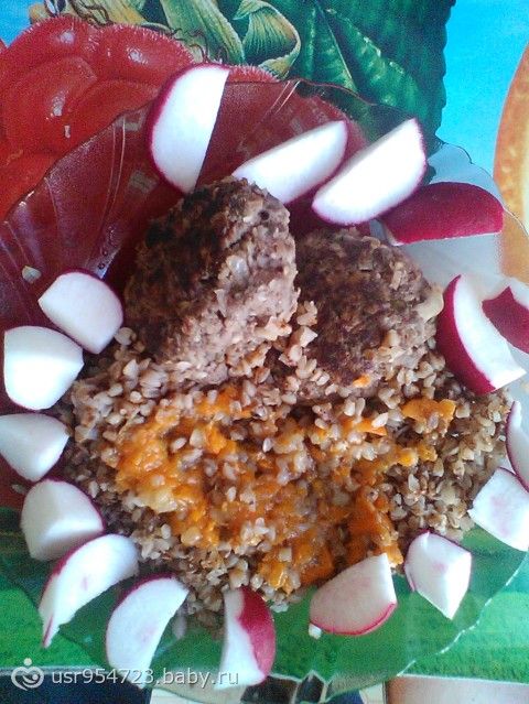 Обед доела гречку наконец-то, 2 котлеты фарш, капустой, морковь, лук, редис