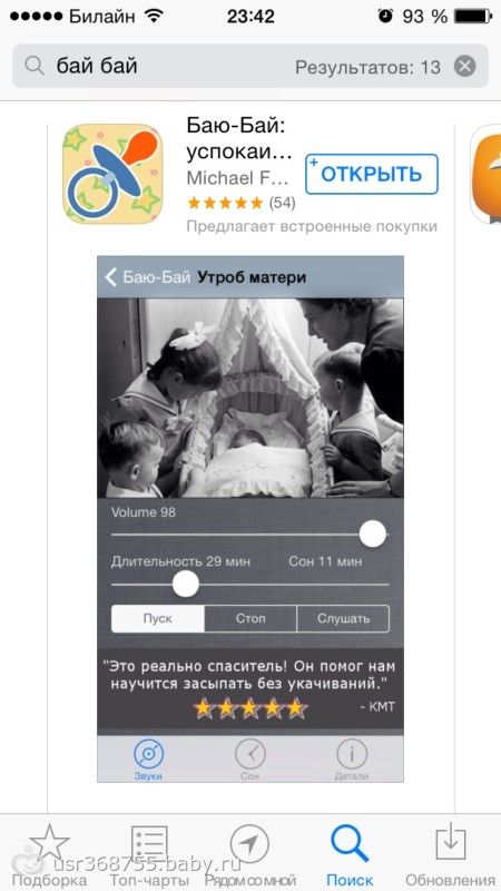 Я много слышала о чудном действии белого шума на новорожденный, но сама не пробовала этот метод. Подруга посоветовала приложение «баю бай». Скачала его сейчас и включила дочери звук утробы матери и она сразу уснула! Чудеса))) всем рекомендую!