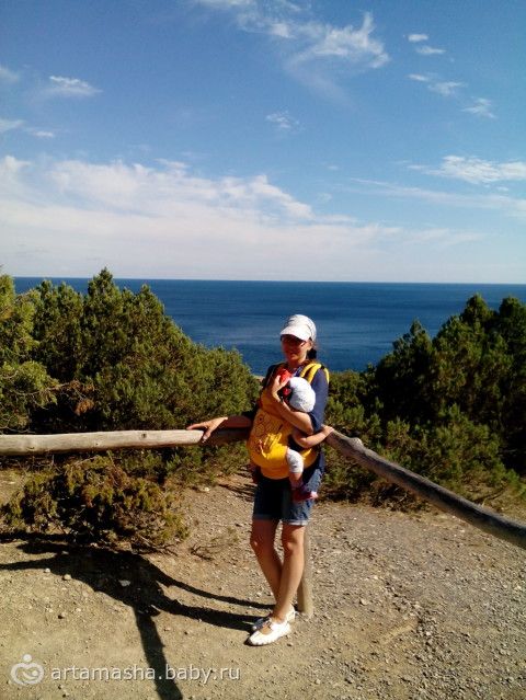 Она в год всего 9 кг весила. Экскурсия была пешая и длинная, по горам, других вариантов не было — только в слинге, она спала всю дорогу) Сначала я несла, потом муж. Да, он сильно старше, я этого не скрываю)