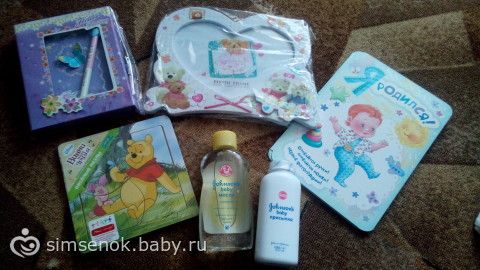 Открытка «я родился» стала для меня очередным знаком того, что у меня будет мальчуган! Очень милая рамка! Уже представила как в ней будет смотреться фотография деток. Пазлы и погремушку в коляску (нет на фото, не смогла отобрать у ребенка) уже приглянулись старшей дочери. Дневничок оставлю на вырост своей зайке.