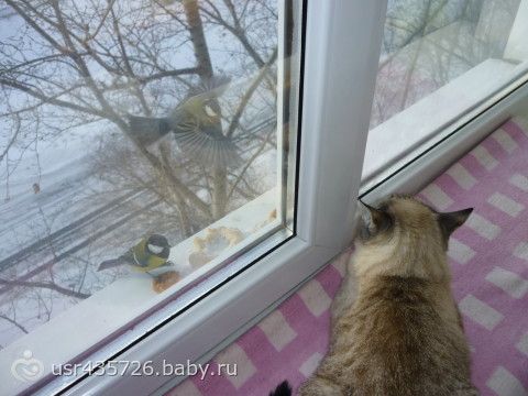 За окном собираются птички, мы за ними наблюдаем. Да и кошке нашей занятие, всё пытается их поймать, сидит на окошке в засаде до темноты, пока за окном не стемнеет.