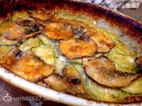 Тонко (почти прозрачно) нарезаете все овощи пластинками. Выкладываем слой картошки, сверху 2 ст.л молока, соль, перец и тертый сыр (у меня чеддер. Следующий слой кабачек, молоко, специи, сыр. Следующий слой грибы, молоко, специи сыр. Потом опять картошка, кабачек, грибы. Сверху молоко, специи и сыр.