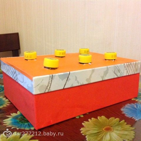 Ходили мы на занятия в семейный клуб и среди множества игрушек обратила на себя внимание коробка с торчащими крышками. Моих детей она очень заинтересовала- и они принялись откручивать и закручивать эти крышки. Мне тоже понравилась эта идея и я решила смастерить её дома. Тем более потребовалось всего ничего- коробка из-под обуви, пара бутылок с крышками, ножницы, клей и цветная бумага для небольшого декора. Вот что получилось в итоге. Мои малыши очень довольны. P.s. Я еще запасаюсь крышками, теряются куда-то они