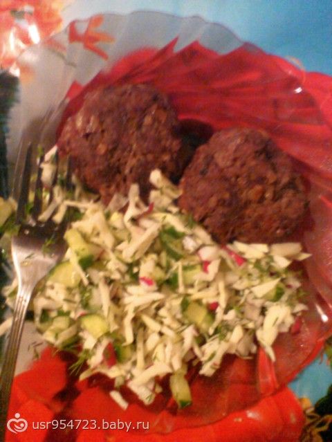 Ужин 2 котлетки, салат капуста, огурцы, редис укроп- полила сверху соевым соусом