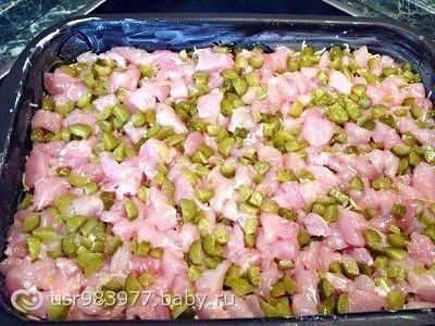 4. На них кладем смесь из сырой курочки (4 филе) и маринованных огурцов (4-6 шт). Солим не много.