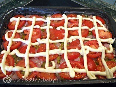 5. Потом ложу помидоры (3-4) кружочками и сеточку из майонеза.