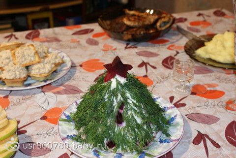 Салат «Ёлочка» Любой слоёный салат и украшаем в виде ёлки. Примерно вот так.