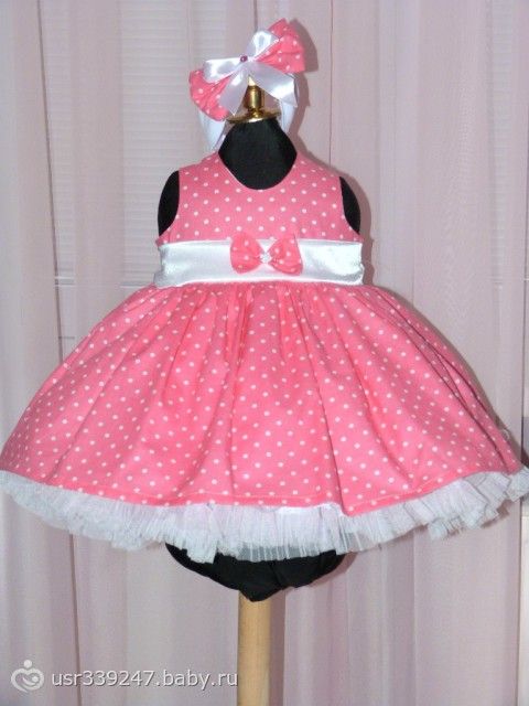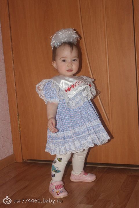 У нас было длинное белое платье, но без фатина и подъюбников и оторочено розовой атласной лентой и бантиками кое-где. На головку надели белые бантики. Вы наверное нарядную повязочку на головку наденете? К ней можно и бантик на зажиме прицепить.