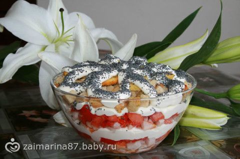 я буду делать все простые салаты — оливье, селедка под шубой, крабовый, в тарталетках сделаю салат из печени трески (печень трески, лук, яйца, вареный картофель или рис, все натереть на терке, заправить майонезом)))