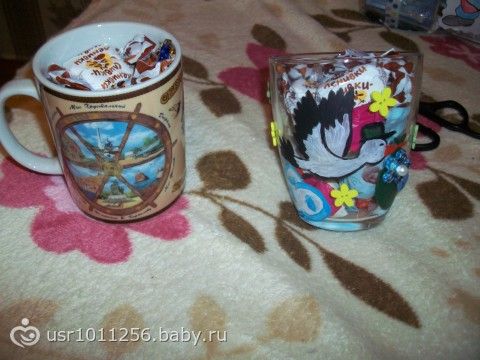 Первым что я распаковала были кружечки, для меня и мужа, наполненные конфетками вкуснючими)) Красивые кружки — это наша с ним слабость. В одну кружечку я безумно влюбилась, она разрисована и декорирована Настенькой. Поставлю ее на полочку и буду любоваться, а потом показывать моей крошке))