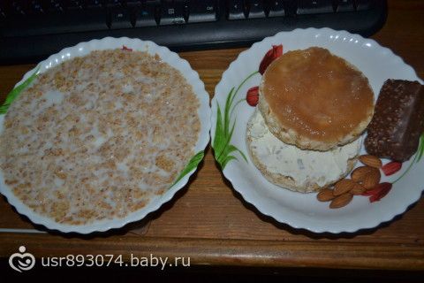 Хлопья с молоком, хлебец с повидлом и творожным сыром, миндаль, конфетка вредная.