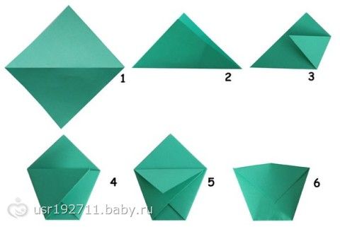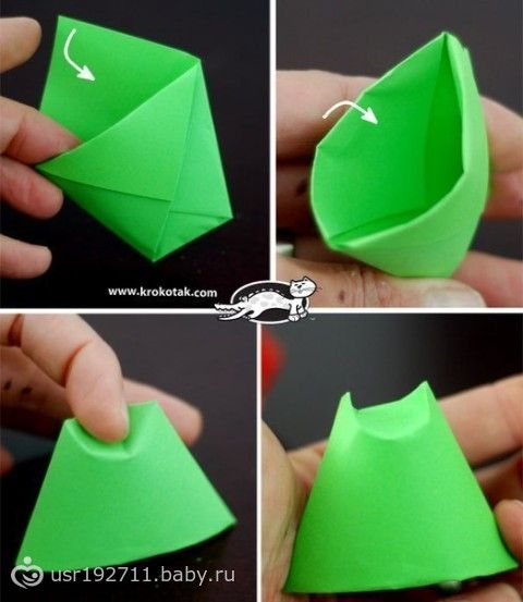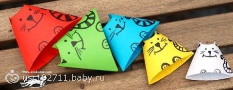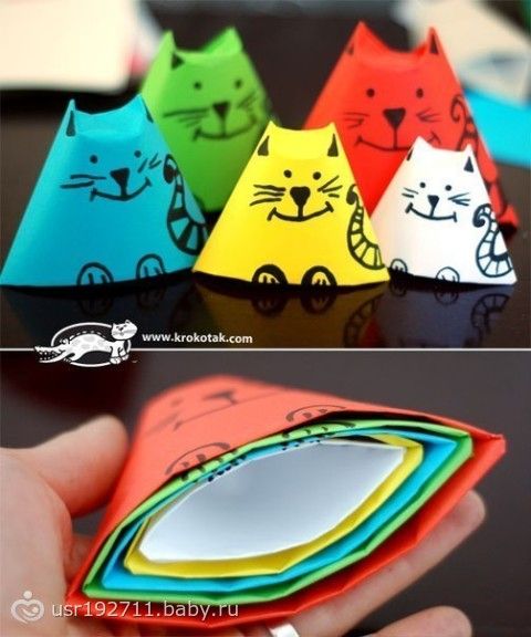 Для этого нужны квадраты цветной бумаги разной величины. Каждый сложите так, как показано на фото. Маркером нарисуйте детали: мордочку, лапы, хвост. Меньшая кошка легко помещается в большую. Ура!