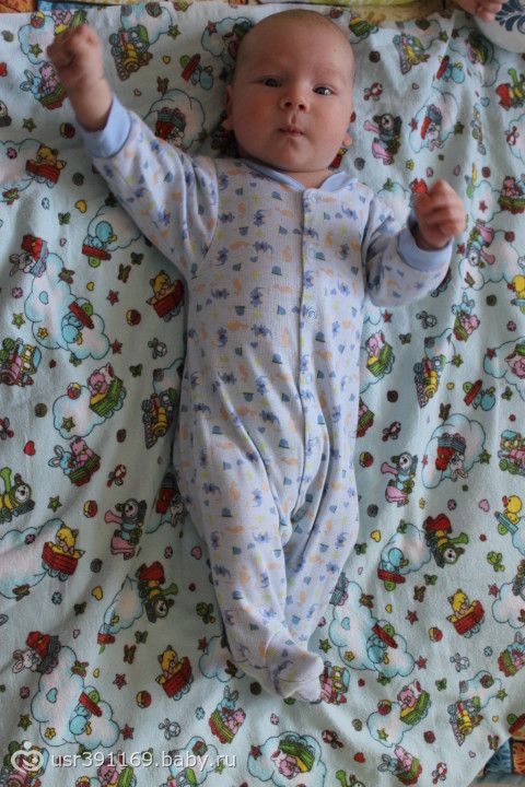 почаще его заставляйте на животике лежать, спинку легонечко чешите и гладьте))) нашему нравится подобный массажик, еще и пукаем лучше от лежания на животе. думаю, должен освоить поднятие головы.