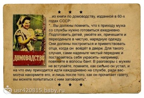 ржака! А что, доля мудрости в этом есть — сытый муж — довольный муж! Только мне кажется там упустили, что детям надо привызяать пионерские галстуки и октябряцкие значки, а жене… может, пилотку одеть?
