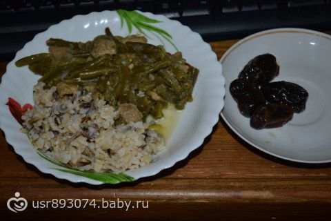 Фасоль тушеная со свининой, смесь золотистого и бурого риса. Финики с чаем.