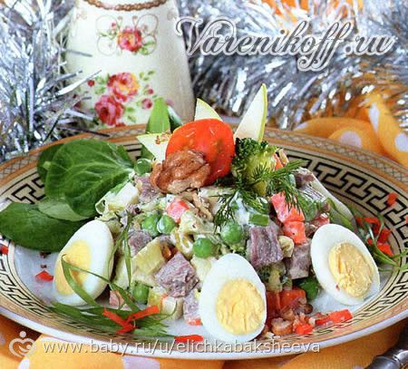 2. Яблоко очистить, удалить сердцевину, мякоть нарезать кубиками. Картофель, морковь и говядину также нарезать кубиками. Подготовленные продукты соединить, добавить консервированный горошек, нашинкованный зеленый лук, заправить соусом. Салат выложить через форму на тарелку, украсить зеленью и половинками перепелиных яиц.