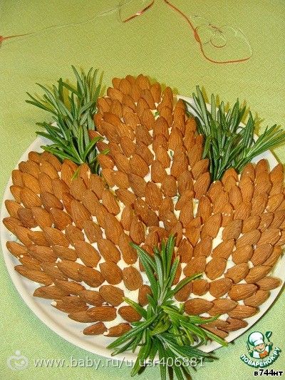 Слои(курица, майонез, грибы, майонез, морковь, майонез, яйца, майонез, сыр с майонезом, миндаль.