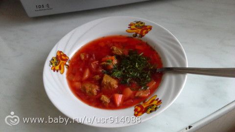 Это борщ))) Даже сейчас когда мы всё ещё соблюдаем постненькую диету я ей варю его из нежирной телятины и без зажарки, а просто с овощами она трескает его за милую душу))) А у ваших деток какое самое любимое блюдо?