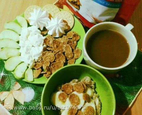 кашка овсяная с бананом, творожок сладкий 4,5 % жирности, половинка яблочка, хлопья мультизерновые, 3 печеньки «Мария», 2 меренга, кофе 3в 1.